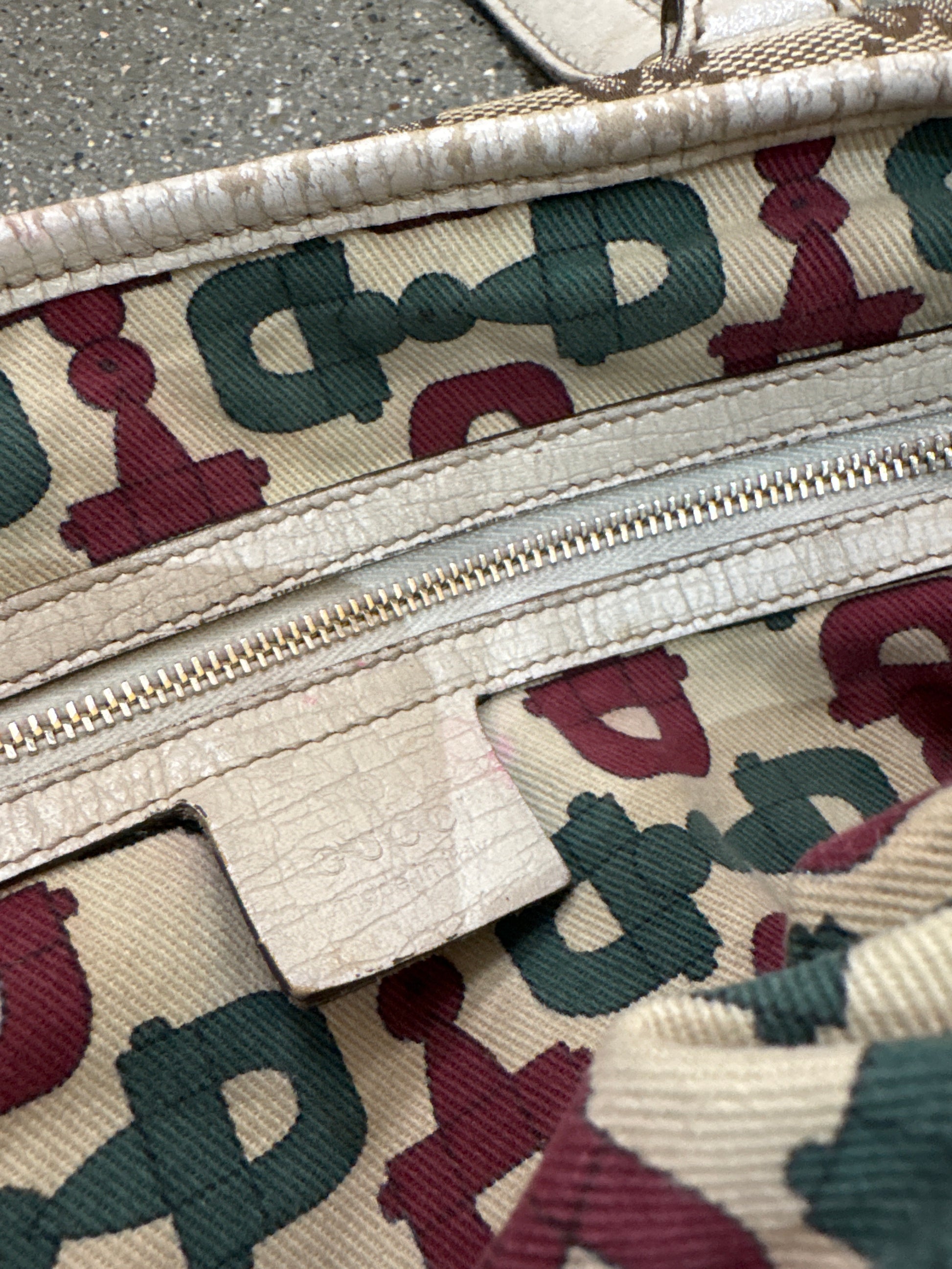 Condition: General Wear, General cracking on the leather on handles, rim of bag. small pink mark & inside bag has a stain only visible inside.